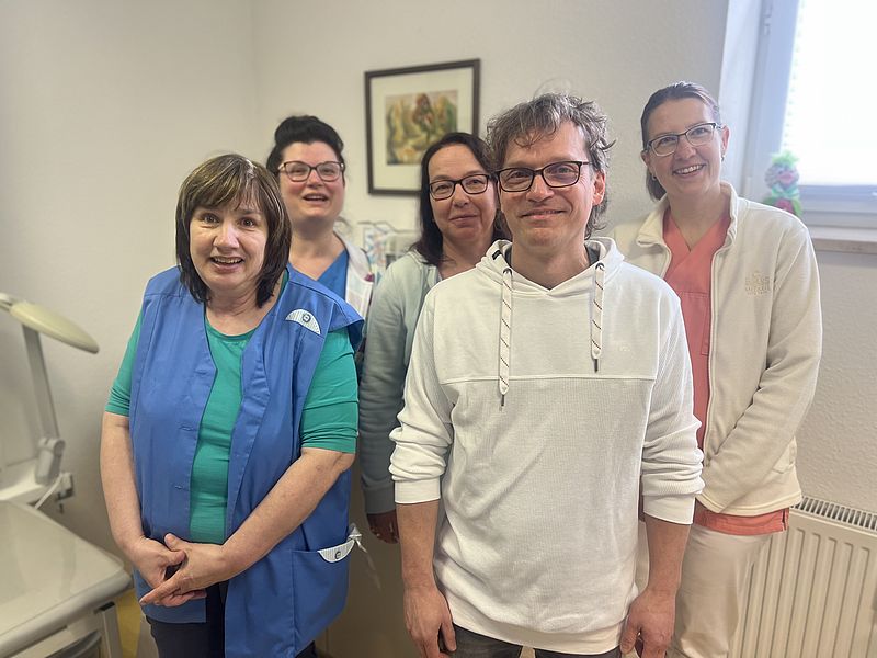 Das Team der Arztpraxis, die nach vier Jahren am Gellertplatz, seit 2008 im rollstuhlgerechten Gebäude zwischen dem Oberen Stadtgraben und dem Markt angesiedelt ist, besteht neben dem Chef aus drei Schwestern und einer Reinigungskraft. Zwei der Schwestern und auch die Reinigungskraft gehören der Praxis schon viele Jahre an.