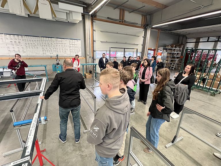 Landrat Sven Krüger sprach zur Eröffnung auch über seinen eigenen Einstieg ins Berufsleben kurz nach der Wende. Es folgte ein Rundgang durch die Werkshallen von Demmelhuber mit Erläuterungen der für die Ausbildung zuständigen Kolleginnen und Kollegen.