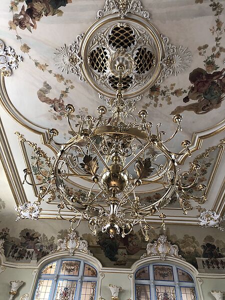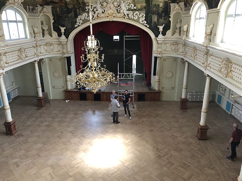 Sowohl der Kronleuchter als auch der Bühnenvorhang sind schon ein echter Blickfang. Schon heute kann man die festliche Atmosphäre erahnen, wenn im Neorokokosaal Konzerte und andere Veranstaltungen stattfinden werden.