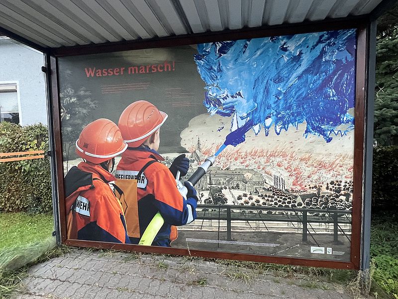 Am 26. September wurde die Feuerwehrbushaltestelle offiziell nach der Fertigstellung an die Stadt übergeben. An der Gestaltung waren viele beteiligt: die Jugendfeuerwehr Hainichen, Frances und Everett Duarte, Kinder aus der DRK-Tagesstätte „Storchennest“, das Gellert-Museum und andere. Das Thema „Feuerwehr“ lag nahe, ist doch das Feuerwehrgerätehaus der Freiwilligen Feuerwehr Hainichen nur einen Steinwurf von der Bushaltestelle entfernt.