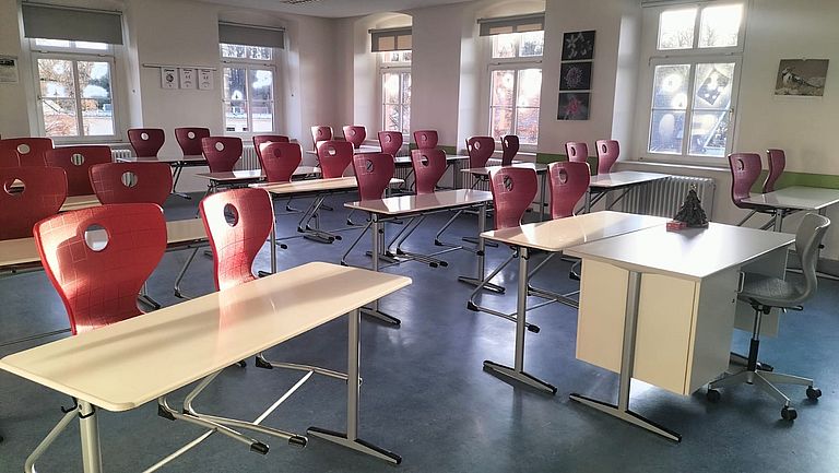 Die Oberschule hat einen Klassenraum modernisiert: Die Stadt stellte neue moderne Tische und Stühle bereit, die durch ihre ergonomische Form für mehr Komfort und gesundes Sitzen sorgen. Die neuen, robusten Tische bieten mehr Arbeitsfläche und passen sich flexibel an verschiedene Unterrichtsformen an.