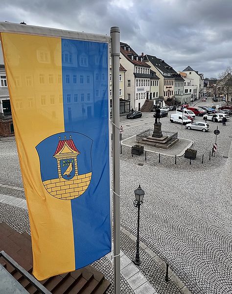 Dem aufmerksamen Besucher des Hainichener Markts ist dies sicher bereits aufgefallen. Seit Ende März hängt dauerhaft eine Fahne mit dem Stadtwappen von Hainichen vor dem Rathaus am Hainichener Markt.