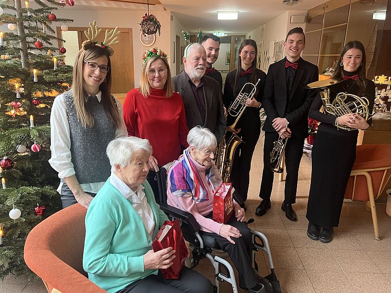 Der 24.12. ist auch im DRK-Seniorenheim auf der Ziegelstraße ein ganz besonderer Tag. Am Vormittag klingen weihnachtliche Klänge durch das Haus. 2025 kamen diese nicht, wie in den Vorjahren vom Posaunenchor der Hainichener Hoffnungskirchgemeinde, sondern von Mitgliedern des Sinfonischen Blasorchesters Frankenberg, allen voran Stadtrat und Orchestermoderator Moritz Wagner. Selbst die Vorsitzende des Klangkörpers, Cornelia Jahn, hatte den Weg aus Lichtenau am Vormittag des Heiligabends nach Hainichen auf sich genommen, um „ihre Jungs und Mädels“ zu unterstützen.
