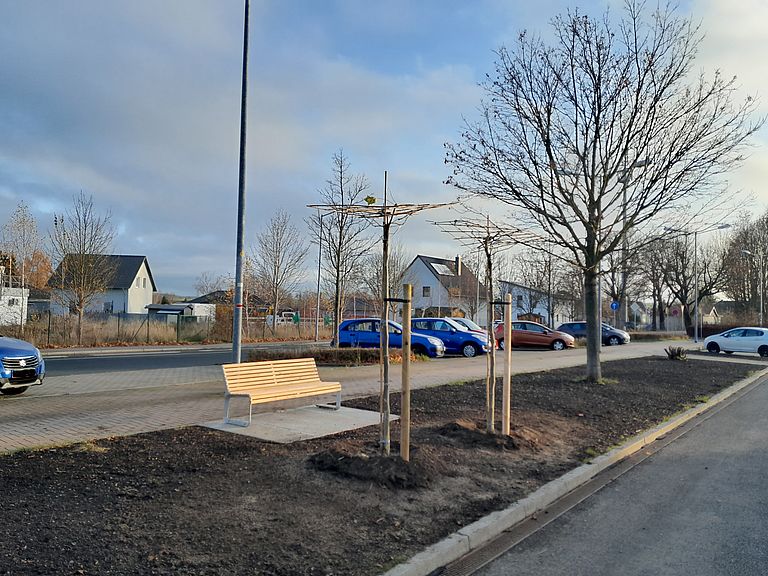 Es wurden pflegeleichte Rasenflächen angelegt und partiell Frühblüher eingebracht. Zudem sind 3 neue Ruhebänke aufgestellt worden, dabei 2 mit vorgelagerter Verschattung aus Dachplatanen. Diese Platanen bilden ihre Kronen flächig aus und gewährleisten dadurch hoffentlich in wenigen Jahren eine natürliche Verschattung der neuen Sitzgelegenheiten.