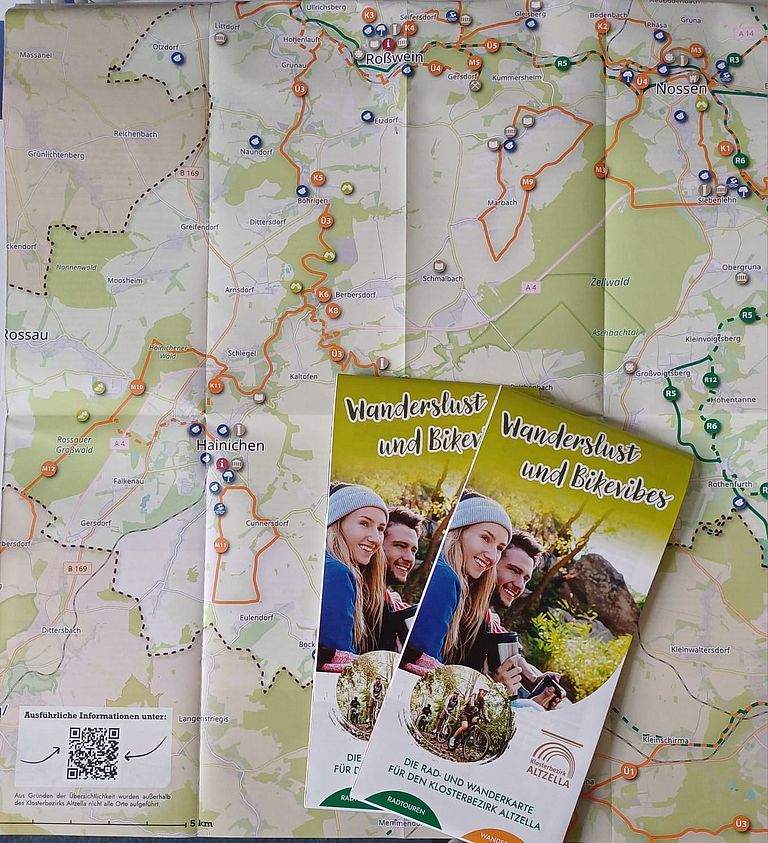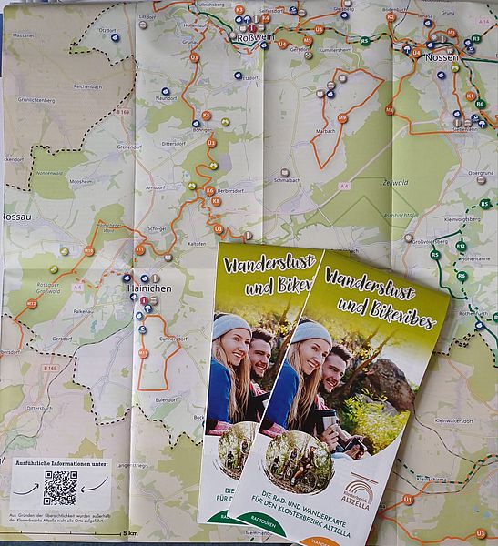 Die Broschüre präsentiert eine detaillierte Wander- und Radwanderkarte, die den Klosterbezirk Altzella sowie angrenzende Gebiete wie Nossen, Reinsberg, Hainichen, Freiberg, Brand-Erbisdorf, Oederan, Flöha, Frankenberg und Augustusburg umfasst. Alle markierten Wander- und Radwege sind mit ihren jeweiligen Kennzeichnungen dargestellt, darunter der bekannte Wanderweg „Grabentour“ und der Radweg entlang der Freiberger Mulde oder in unserer Region der Entenschnabelweg im Striegistal oder der Roßweiner Bergbaulehrpfad.