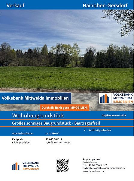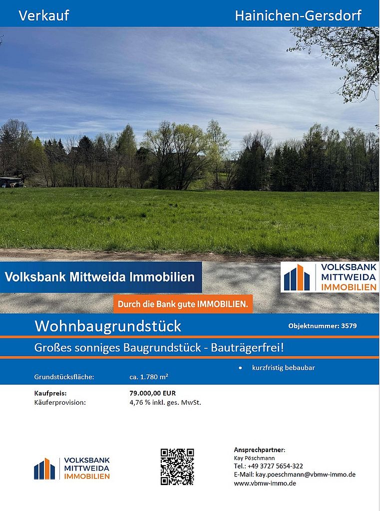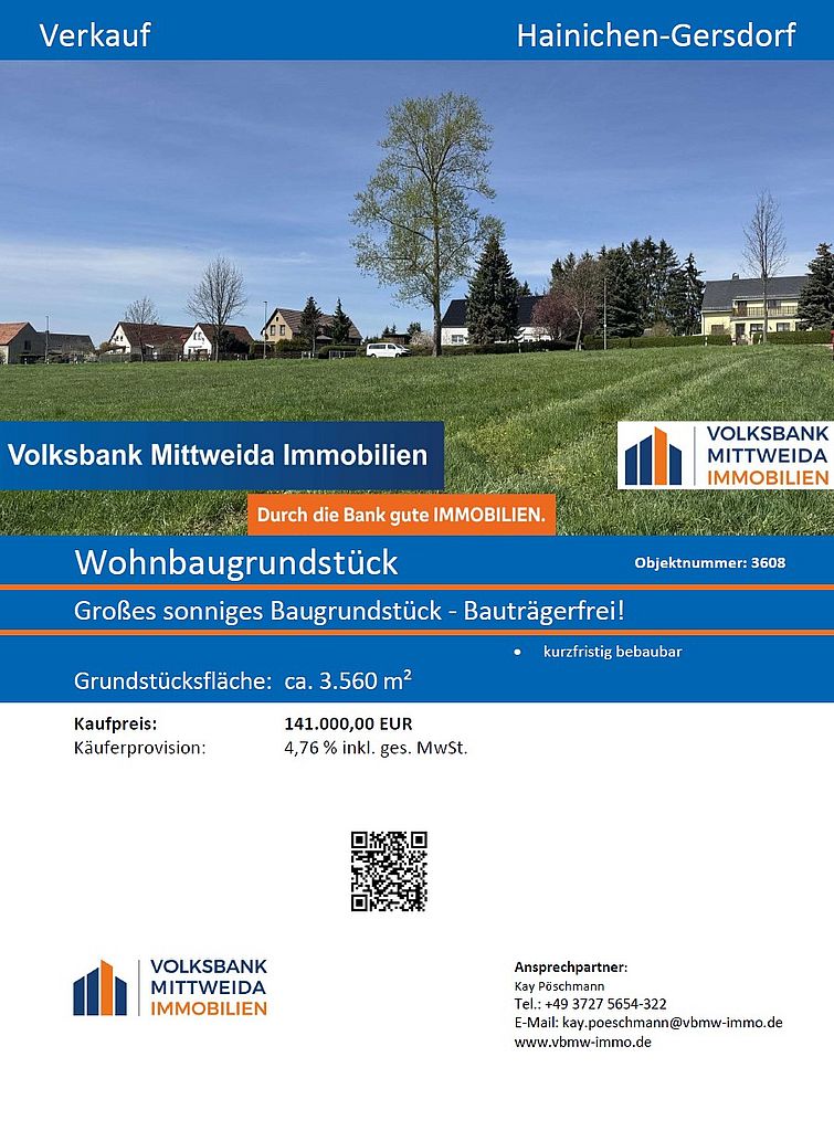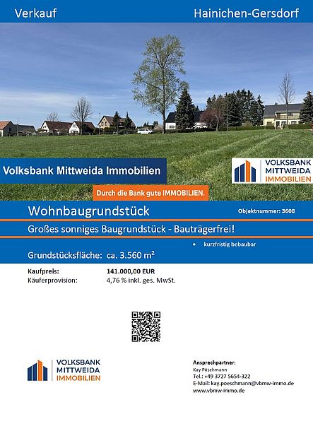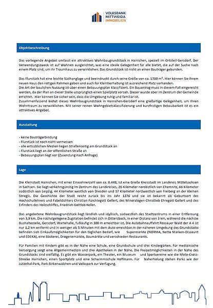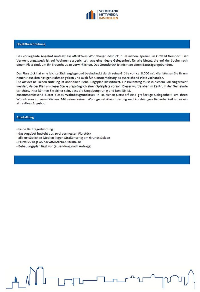 Die Stadt Hainichen verkauft die in den Exposés aufgeführten Wohnbaugrundstücke. Bei Interesse wenden Sie sich bitte an die Volksbank Mittweida. Die Kontaktdaten finden Sie im Exposé.