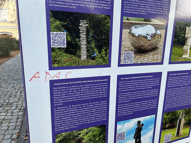 Gefühlt kommen täglich weitere Verunstaltungen hinzu, so auch am Keller-Brunnen und an der Beschilderung am Purple Path. Die Hieroglyphen sind nicht nur teilweise verfassungswidrig und potthässlich, sie sind auch extrem ärgerlich. Ohne der Fahndung durch die Polizei vorzugreifen, halte ich es für sehr wahrscheinlich, dass die Verunstaltungen vom gleichen Täter/den gleichen Tätern stammen.