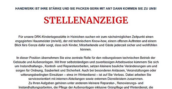 Kalendar07.01.2026DRK-Kindertagesstätte in Hainichen sucht zum nächstmöglichen Zeitpunkt einen engagierten Hausmeister Weiterlesen