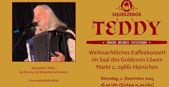Kalendar11.11.202502.12.2025 - Weihnachtliches Kaffeekonzert im Saal des Goldenen Löwen mit Squeezebox Teddy Weiterlesen